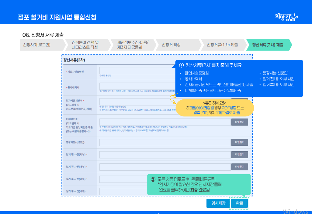 - 필요 서류 업로드 (사업자등록증 폐업신고서, 철거 견적서, 사진 등)