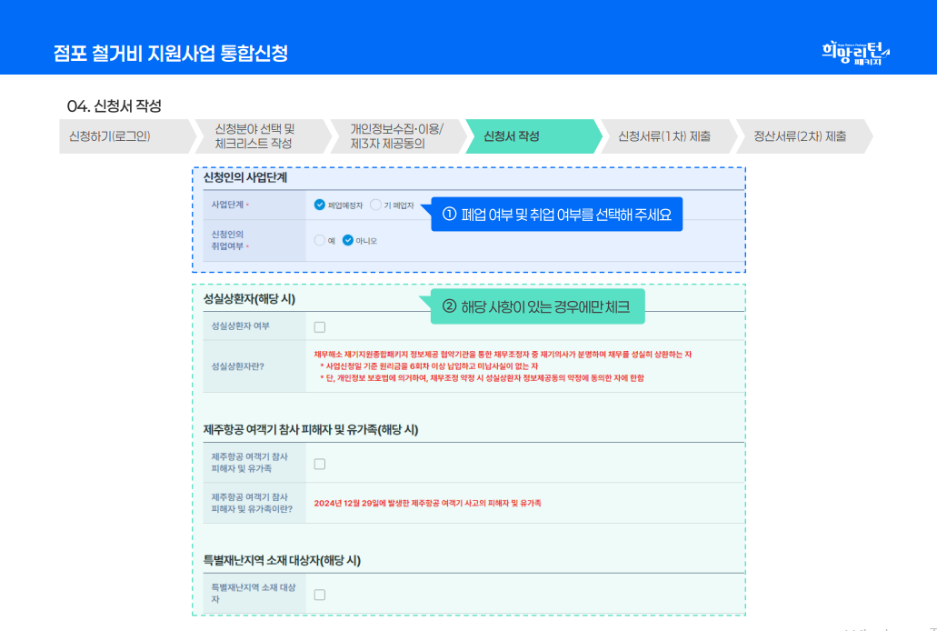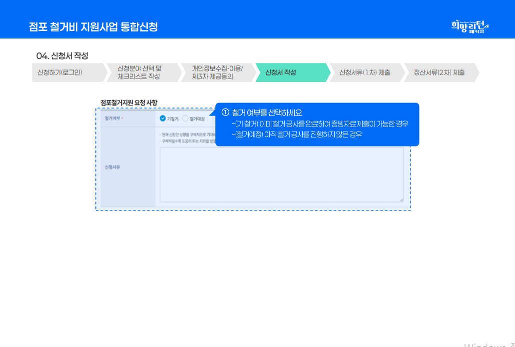 - 희망리턴패키지 철거지원금 온라인 신청서 작성