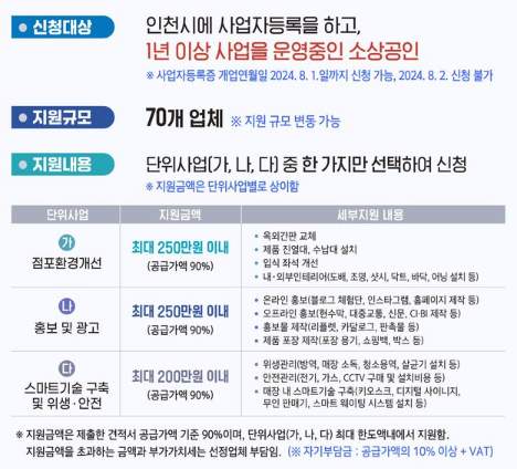 - 지원대상 : 인천시에 사업자등록을 하고 1년 이상 사업을 운영 중인 소상공인